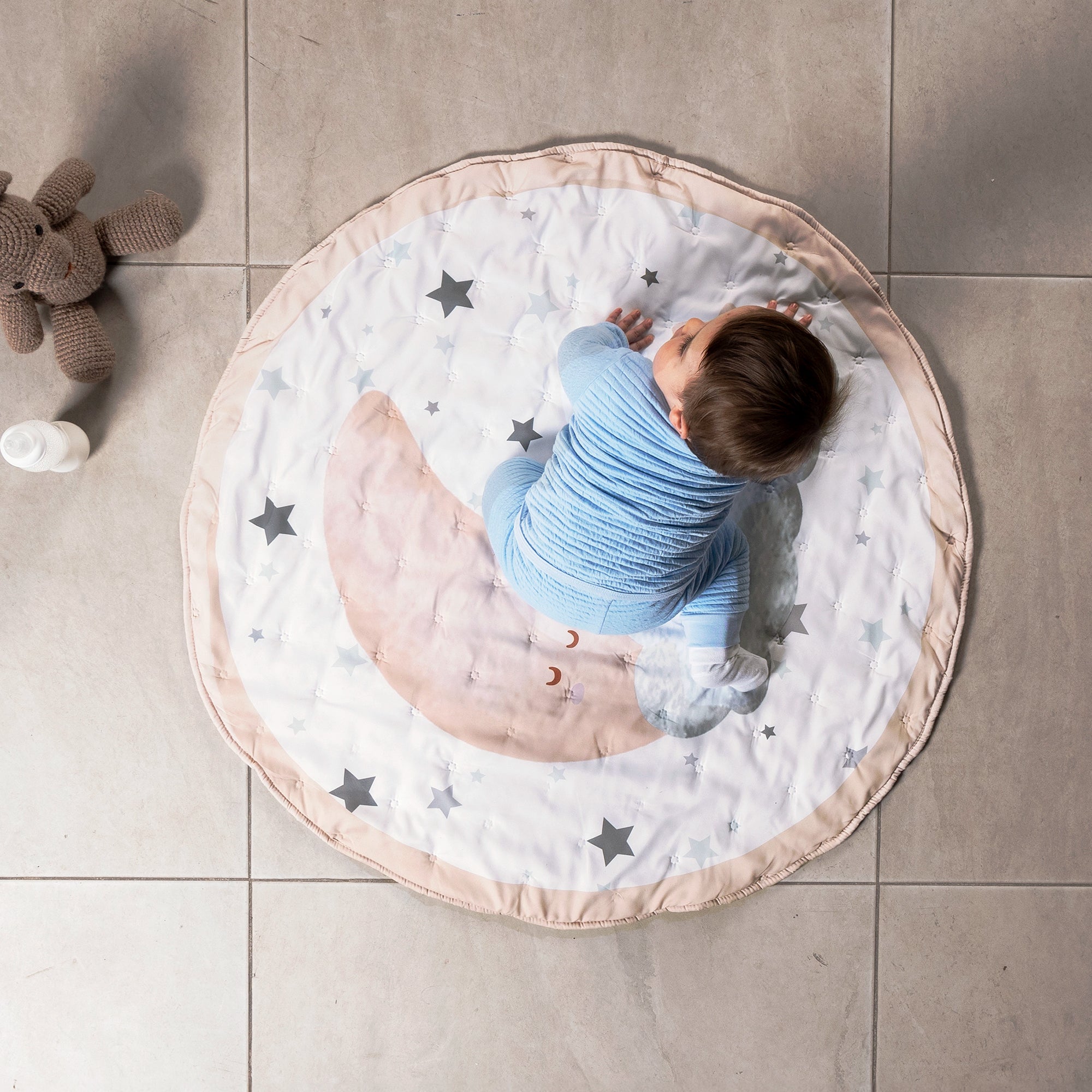 ¡Transforma el tiempo de juego en una experiencia celestial con nuestro tapete mágico de lunita y estrellas para bebé! Ideal para esos momentos de juego. Evita el paso del frío, además de que tiene reverso antiderrapante.