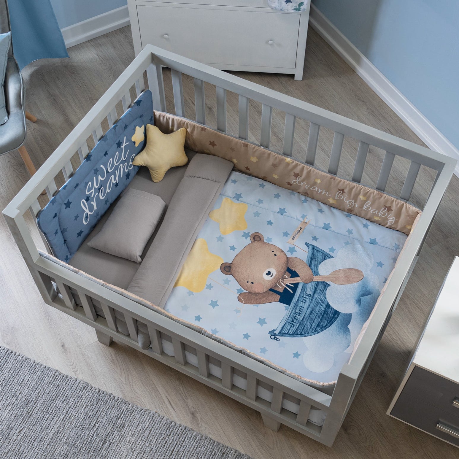 Dale un look acogedor al dormitorio de tu bebé con el Edredón Baby Marinero. Su tierno diseño de osito en gamas de azul y kaki harán de su espacio un lugar muy especial. Juego de edredón doble vista. Ligero y suave. Incluye edredón, protector de cabecera, protector de barandal y cojín. Sábana de cajón y funda de almohada.