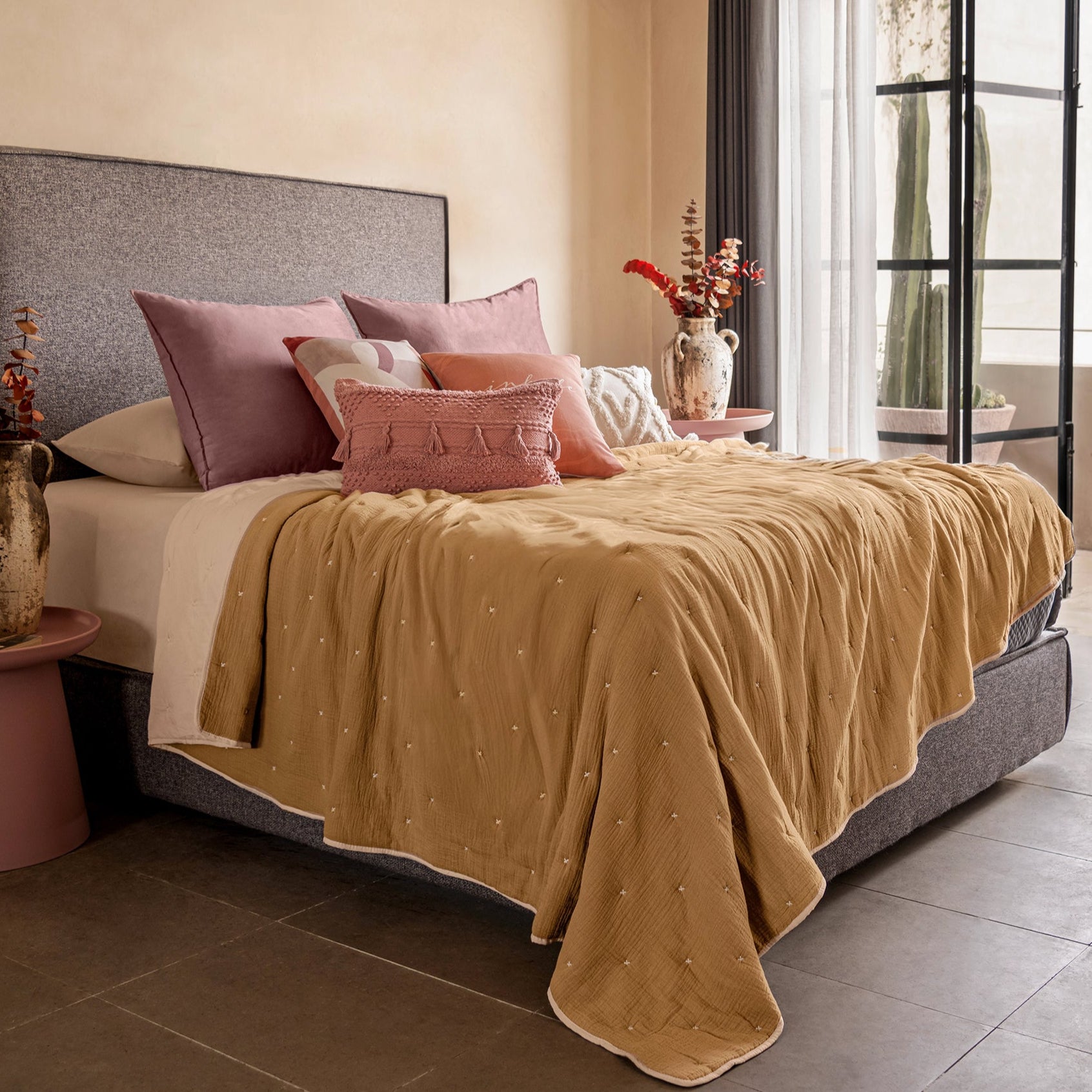 Experimenta la serenidad y el lujo con nuestro edredón premium de muselina. Elaborado con suave algodón en un tono camel, este edredón combina la delicadeza de la muselina con la excelencia de la calidad premium. Sumérgete en un descanso extraordinario y eleva tu espacio con esta pieza única y sofisticada.