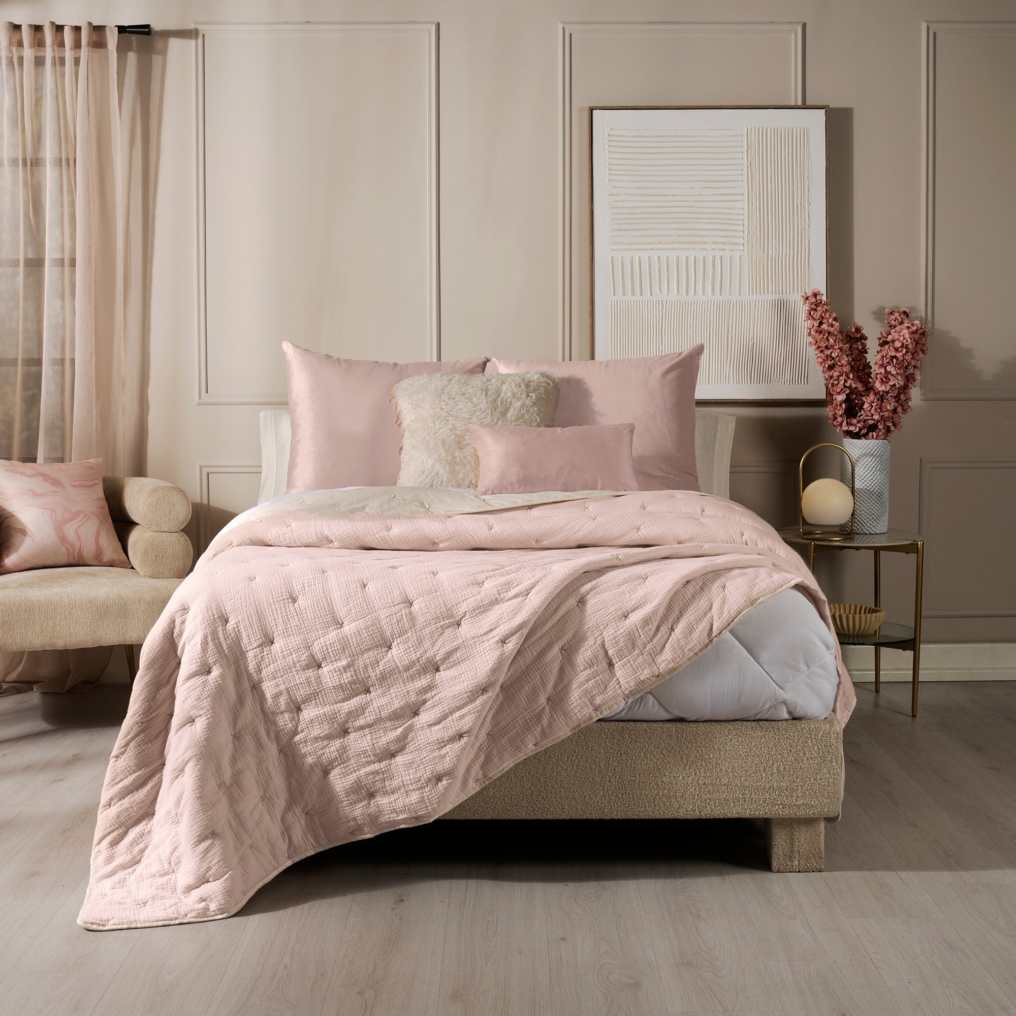 Edredón Voga Petal, con una textura suave y ligera que ofrece comodidad y frescura. Su diseño y combinación rosa y beige es delicado y elegante aportando un toque moderno y acogedor a tu dormitorio.