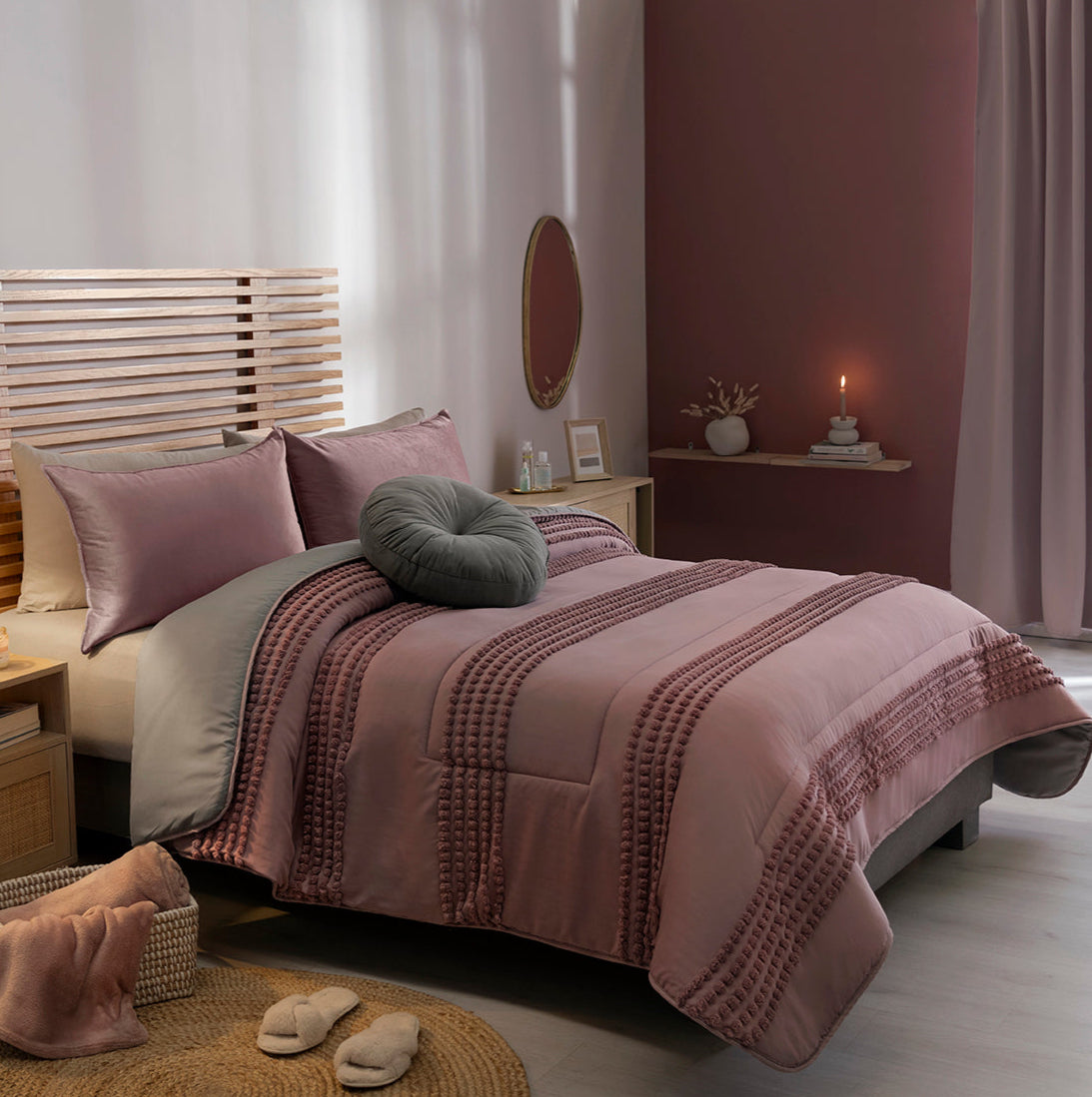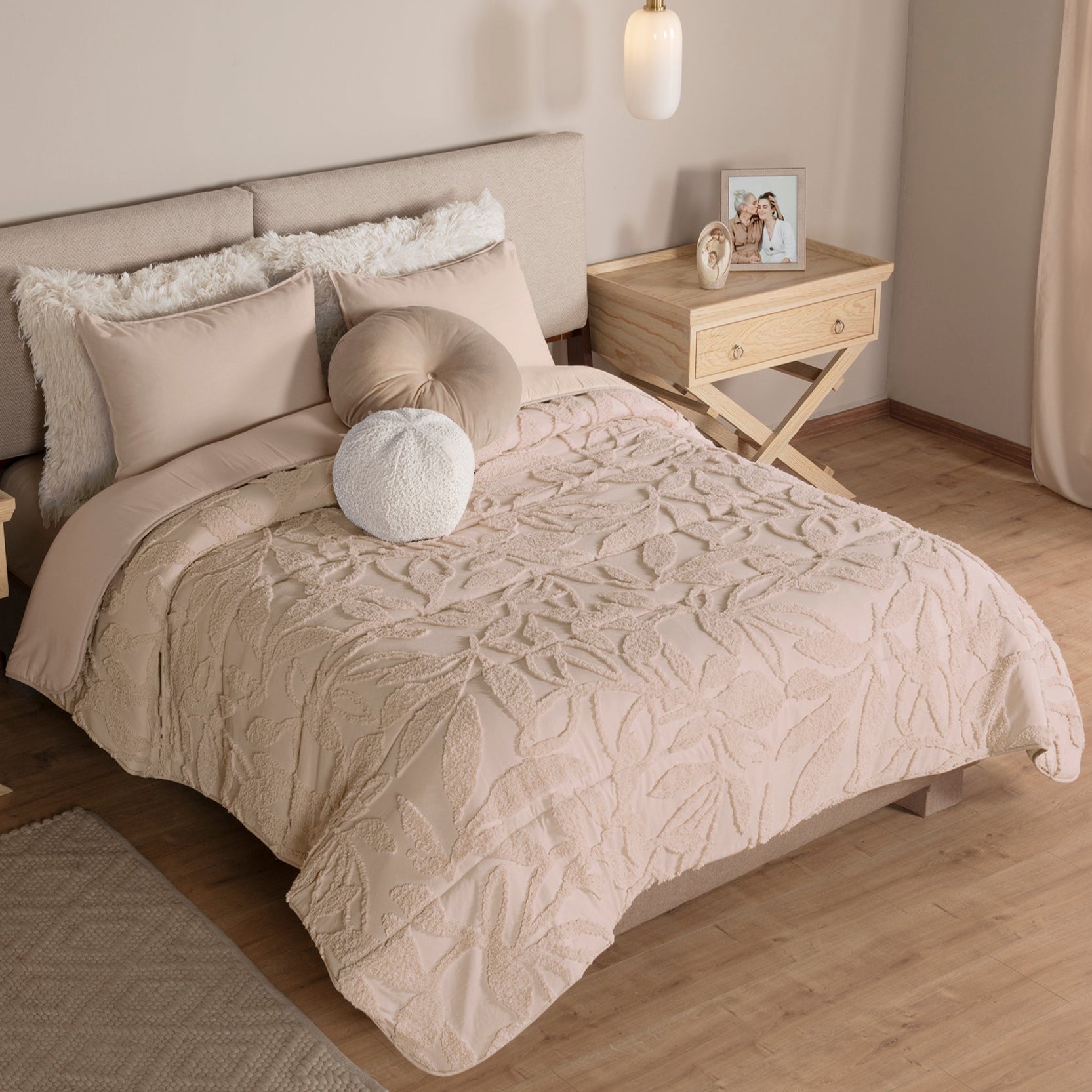 Transforma tu espacio de descanso con el Edredón Castilla. Su textura de hojas en relieve, en conjunto con los tonos neutros, lo harán la pieza protagonista de tu dormitorio. Juego de edredón con especialidad de textura. Suave por su textura viasoft.
