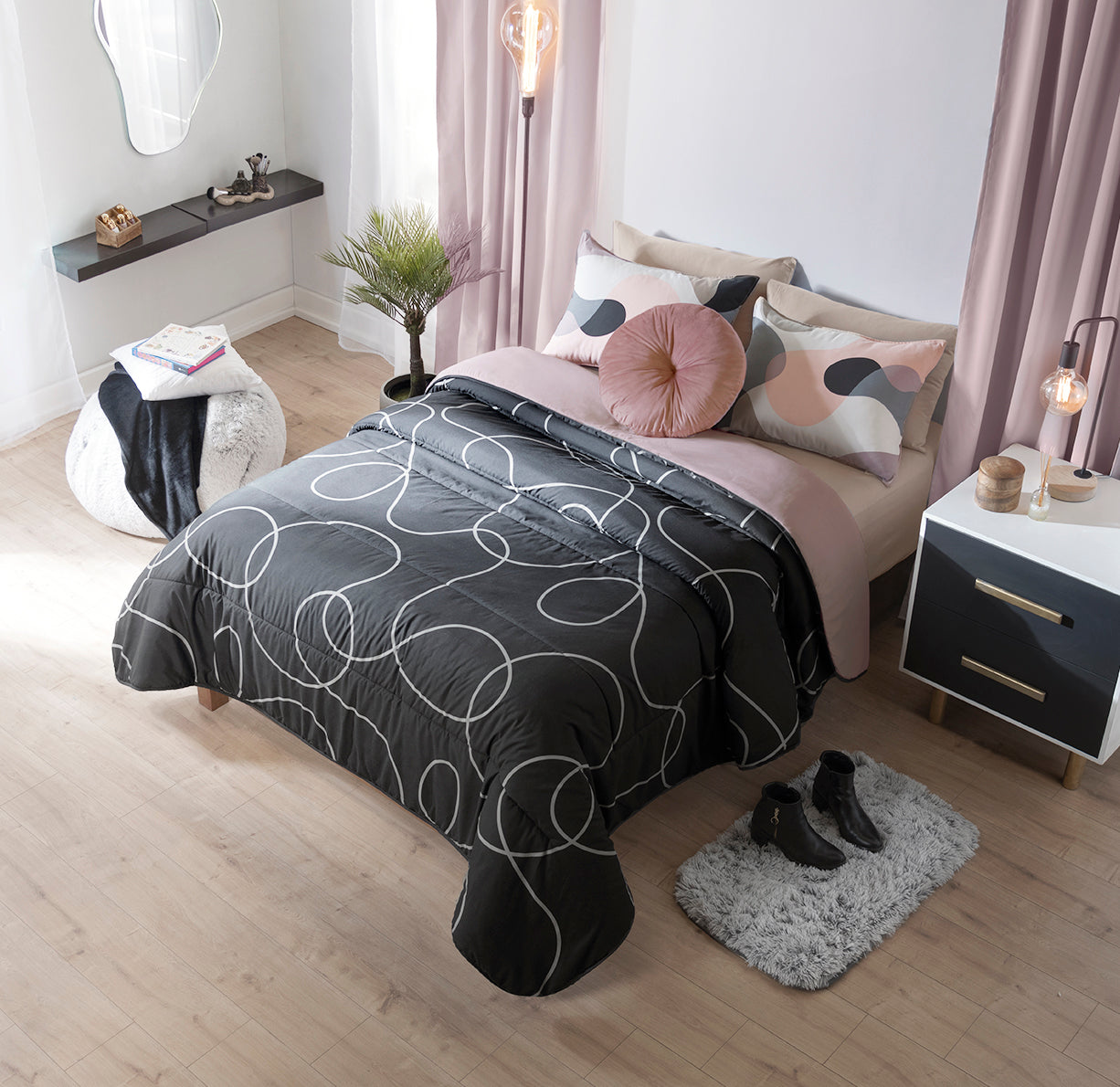 «Line Art»: la belleza de una sola línea. Viste tu cama con este edredón y descubre la belleza de lo simple. Amarás la transformación de tu cuarto. Juego de edredón, incluye fundas de almohada y cojín velvet en forma de círculo.