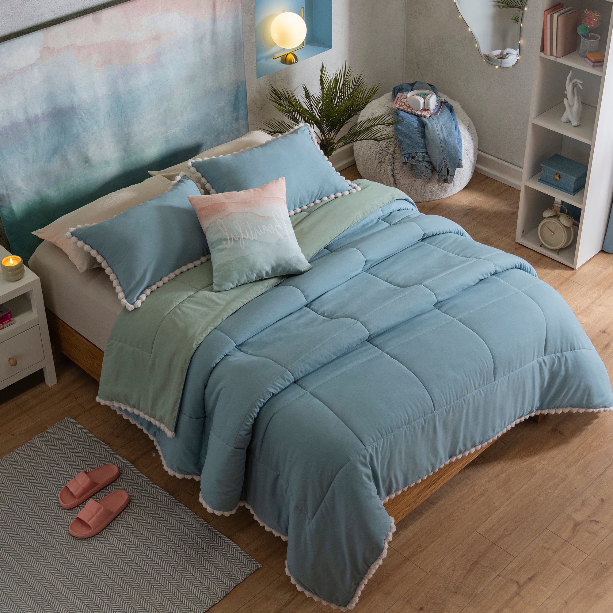 Azul es el color del cielo. Envuelve de armonía tu habitación y ten dulces sueños con nuestro tono favorito para crear ambientes llenos de paz. Juego de edredón con esponjosos pompones en el contorno del edredón. Incluye fundas de almohada decorativas y cojín decorativo.