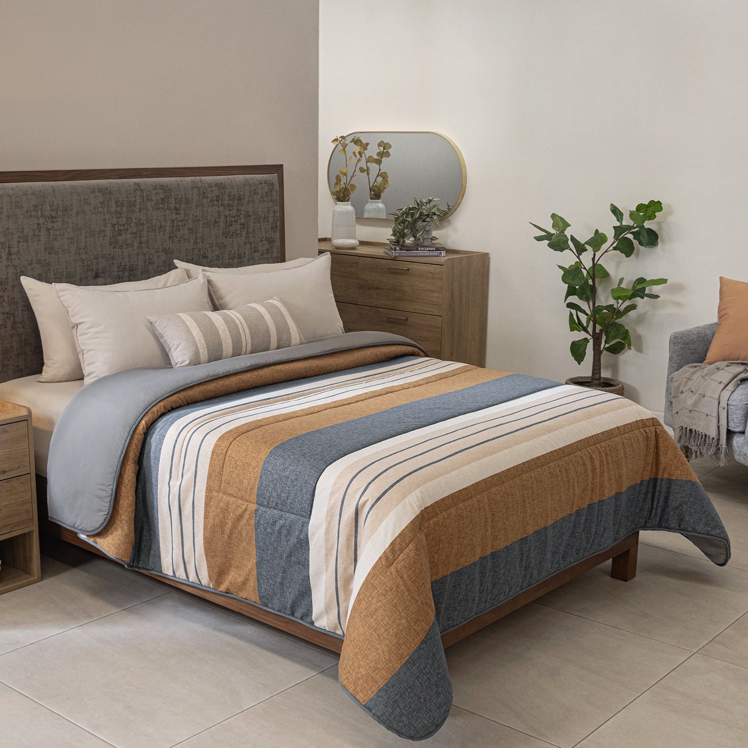 Si buscas un look neutro y atemporal, el Edredón Talpa es ideal para ti. Su combinación de franjas en gris y neutros logran un equilibrio perfecto entre calidez y neutralidad. Juego de edredón estampado, suave por su textura con acabado tipo lino. Incluye cojín estampado.